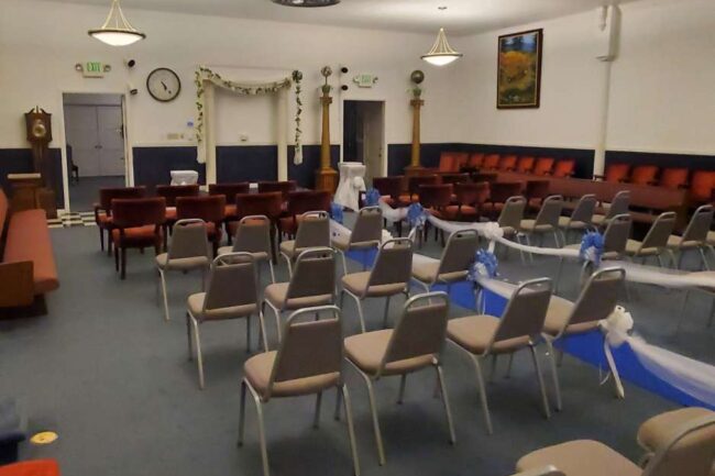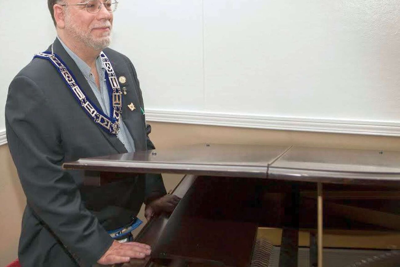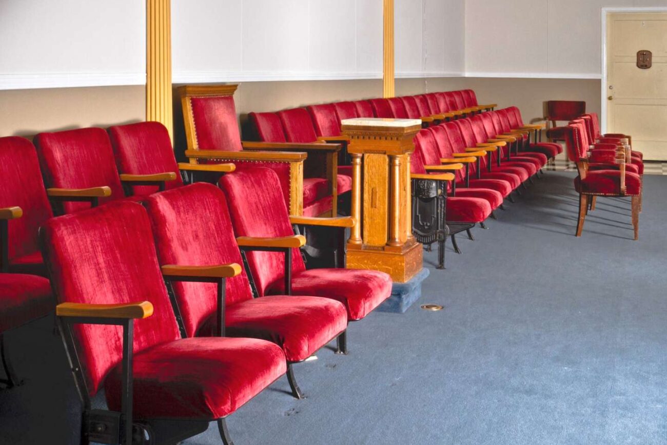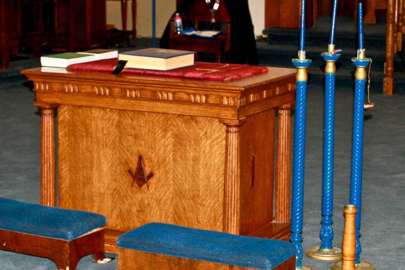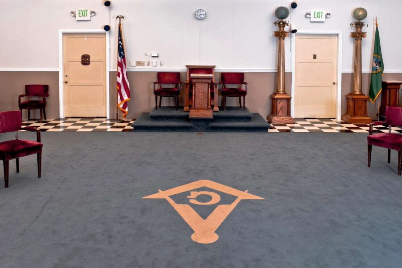 Like all traditional Masonic Lodges, ours is situated due east and west. This has its roots in The Tabernacle of Moses and King Solomon’s Temple. In the meeting room, officers sit in chairs according to direction, Our chairs, which look like theater seats, are all remnants from the Opera House. There’s a special seat for the Secretary. The grand piano remains, although the harmonium organ which was once there has been removed.