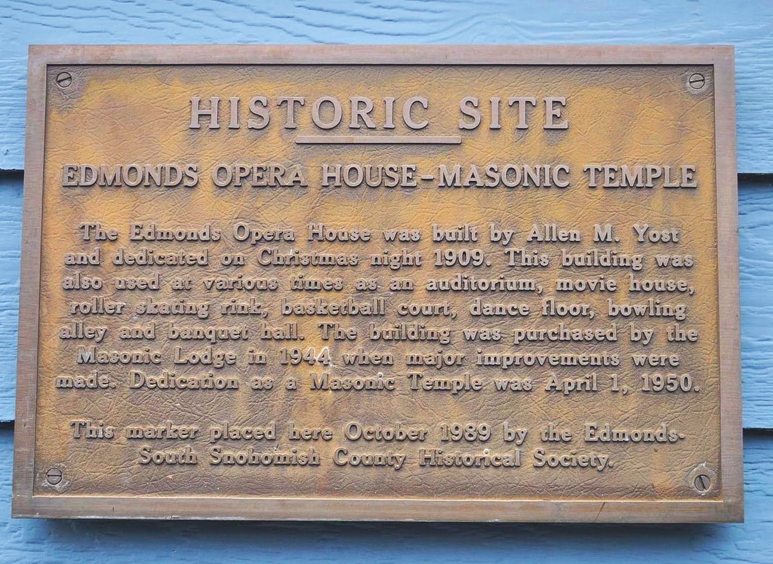 Our lodge building was built in 1902 and dedicated in 1909. Through it’s many years, it served a number of functions including an athletic club including basketball, bowling and boxing, an auditorium, a movie house, a roller-skating rink, a dance floor and a banquet hall. Perhaps most famously, it was an Opera House. Edmonds Masonic Lodge #165 acquired it in 1944, with dedication in 1950. It has served the men and the community of Edmonds since then.