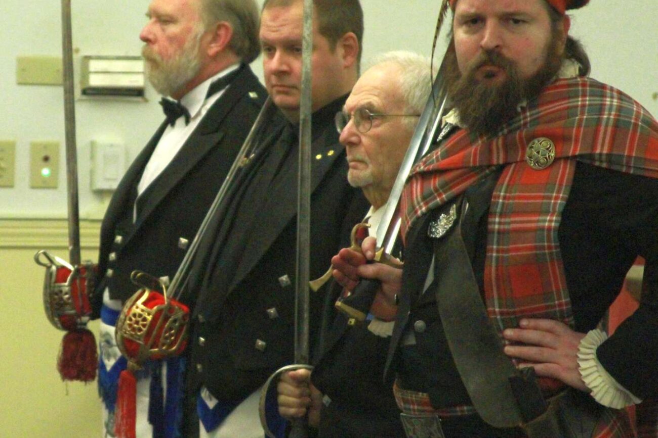 The Tyler’s Jewel is the Sword, by which he symbolically refuses entrance to anyone who is uninitiated in the Craft. The sword has no scabbard, as it is his symbolic duty to always have his sword drawn, ready for the defense of his post. His duties and principal role are to ensure that only those who are duly qualified are allowed to enter the Lodge Room. He guards against cowans and eavesdroppers. During the Middle Ages, a cowan (aka a “jackleg”) was an uninitiated or non-apprenticed stonemason, a man who built stone walls of poor quality.
